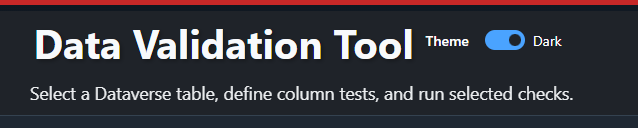 The tool lets you connect to Dataverse, choose a table, pick the columns you care about, and assign one or more tests to those columns.