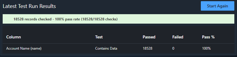 Once you run it, it will pull back the data and show you how it performed. You get an overall pass rate, plus a breakdown by column and by test, so you can see where things are going wrong.